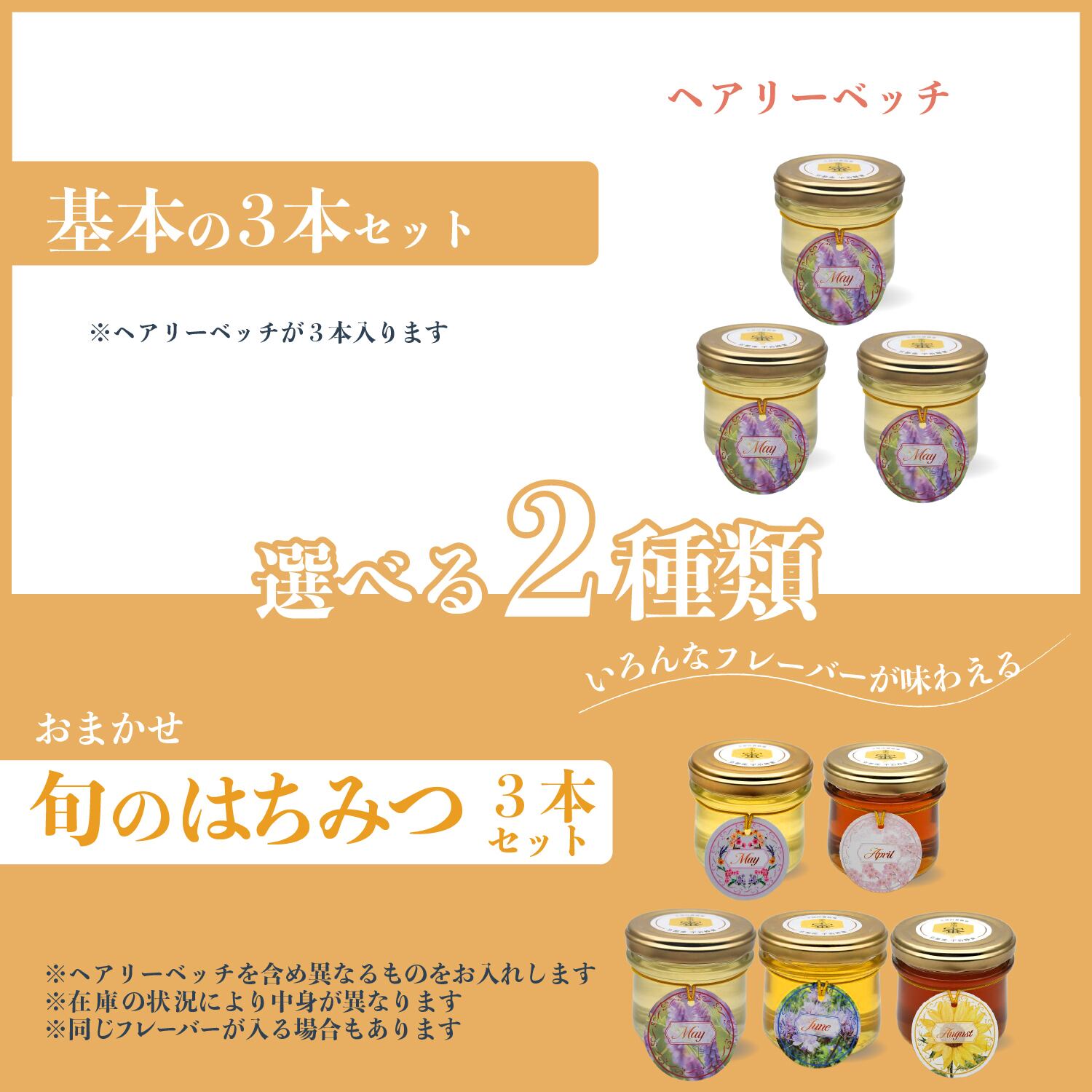 中身は「基本の3本」セットか「旬のはちみつ」セットをお選びいただけます。